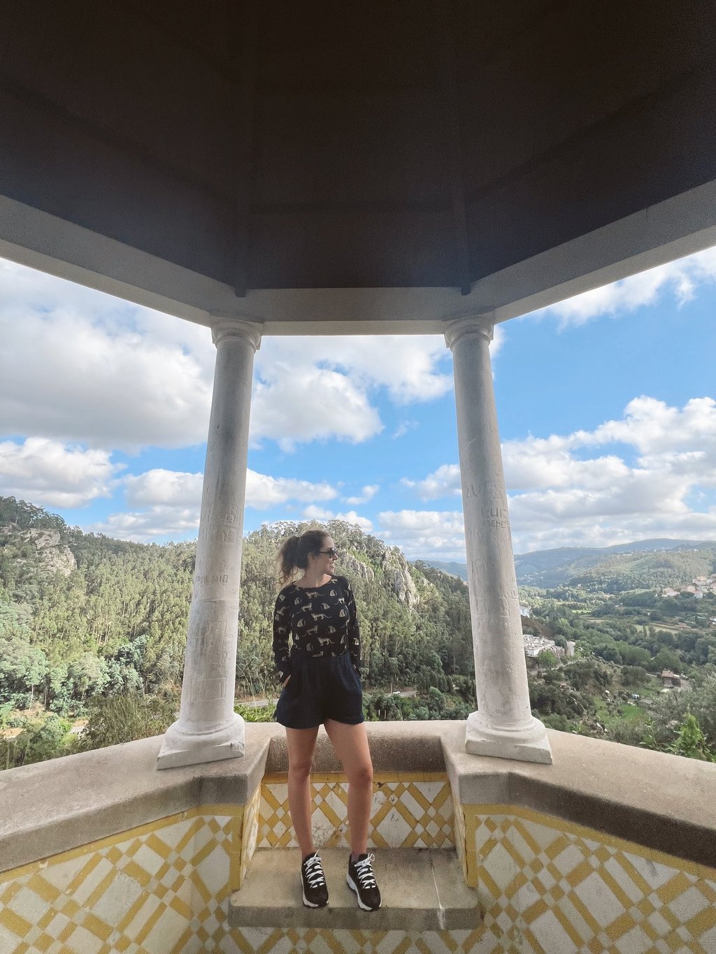 A varanda românica situada no extremo do Jardim do Largo Alberto Leitão oferece vistas deslumbrantes e é ideal para quem quer relaxar em uma esplanada. Ainda dá para tirar uma foto junto a instalação da Estrada Nacional 2.