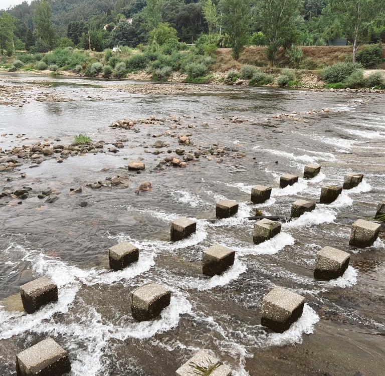 Praia Fluvial do Reconquinho (letra C): nas margens do Rio Mondengo, uma praia fluvial pitoresca. Foi nosso quintal por alguns dias, há um camping e área gratuita para motorhome.